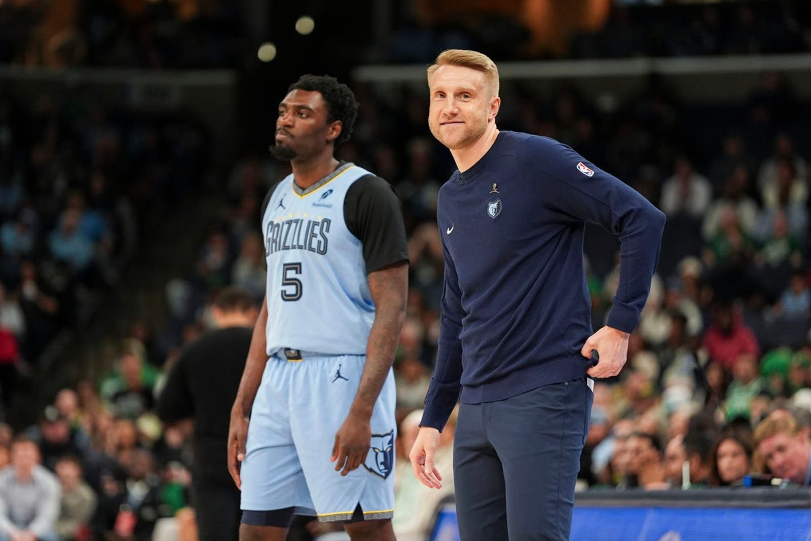在3月31号灰熊对阵凯尔特人的比赛中(凯尔特人117-103获胜),戴重点关注了两个特殊角度:新任临时主教练图奥马斯·伊萨洛(Tuomas Iisalo)的场边表现,以及圣路易斯籍球星杰森·塔图姆(Jason Tatum)与球迷的互动。