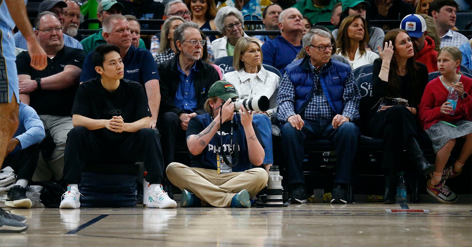 在联邦快递论坛体育场(FedExForum),摄影师必须遵守严格的拍摄规则。他们需要全程保持固定座位,仅可在中场休息时传送照片,比赛结束后方可进入场内。作为一名身高6英尺3英寸的摄影师,长时间保持固定姿势对戴来说颇具挑战。