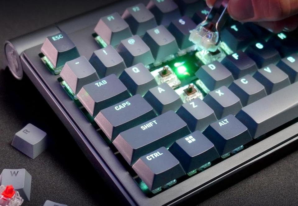 这款面向职业电竞选手的高端机械键盘采用87键布局设计,配备热插拔Cherry MX2A轴体。键盘支持三种连接模式:有线、2.4GHz无线和蓝牙。其中2.4GHz无线模式下轮询率达4,000Hz,有线连接时可提升至8,000Hz,确保游戏时的超快响应速度。