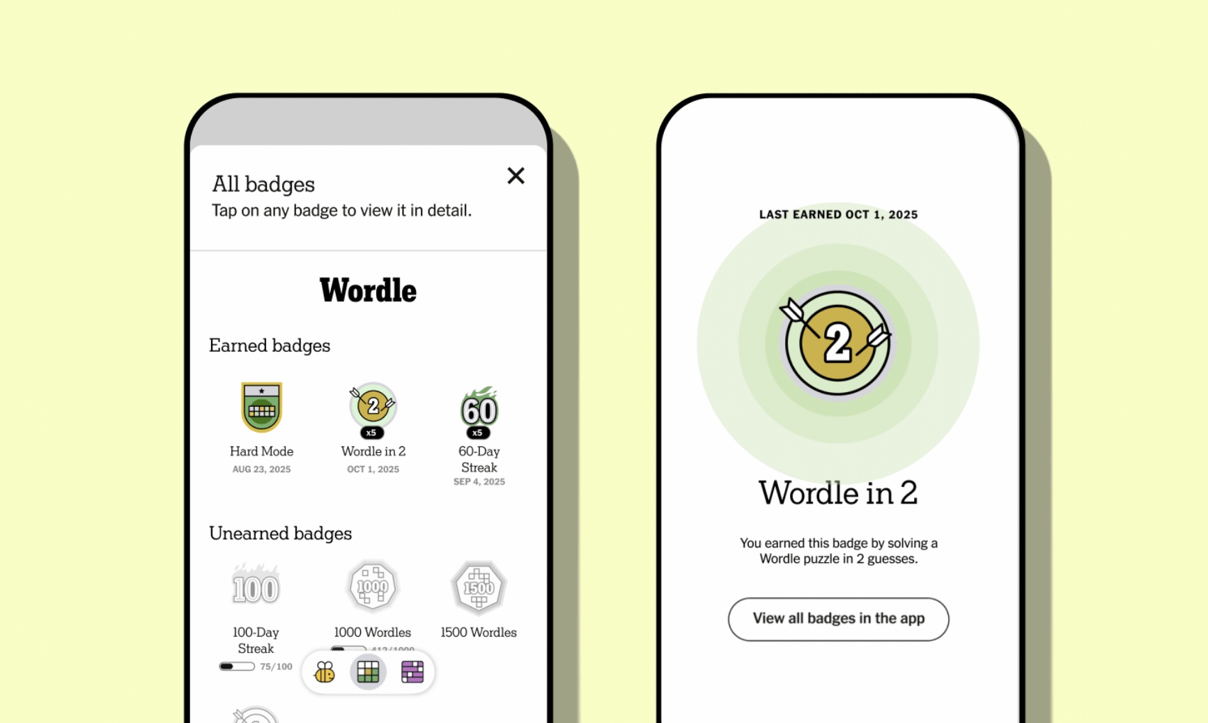 《纽约时报》(New York Times)为旗下热门益智游戏推出成就徽章系统。玩家在填字游戏(Wordle)、拼字游戏(Spelling Bee)和连线游戏(Connections)中完成特定挑战后可获得数字奖杯。例如,一次尝试解开Wordle谜题、在Connections中获得完美得分,或在Spelling Bee中收集全字母词等。