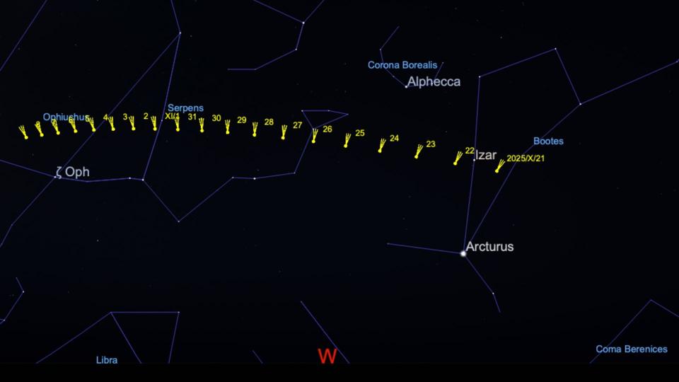 本周将是从北半球观测勒蒙彗星(Comet Lemmon,C/2025 A6)以及较暗的天鹅彗星(Comet SWAN,C/2025 R2)的最后机会。在日落后约90分钟,使用双筒望远镜可以分别在东北方和西南方看到这两颗彗星。10月28日,这两颗彗星都已经过了最近地点,正在逐渐远离地球,而勒蒙彗星将在11月8日到达近日点,届时它将最接近太阳。
