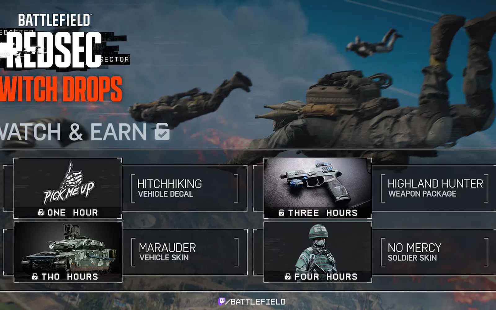 具体奖励获取要求如下: | 掉落奖励 | 获取条件 | | --- | --- | | "搭便车"载具贴花 | 观看直播1小时 | | "掠夺者"载具涂装 | 观看直播2小时 | | "高地猎手"武器包 | 观看直播3小时 | | "无情"士兵皮肤 | 观看直播4小时 |