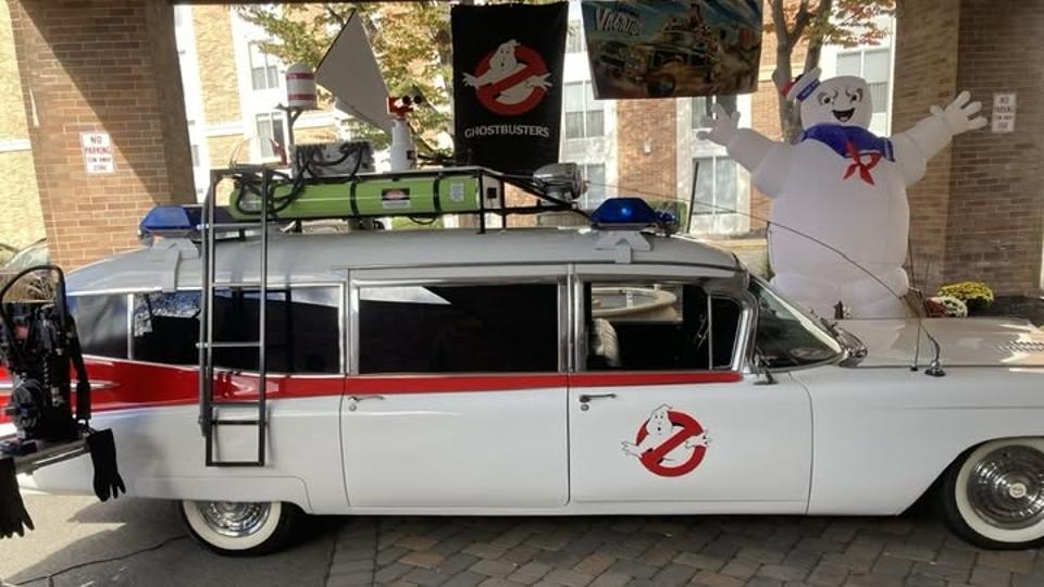 在奇乐剧院展会(Chiller Theater Expo)外展出的《捉鬼敢死队》(Ghostbusters)标志性救护车复制品。