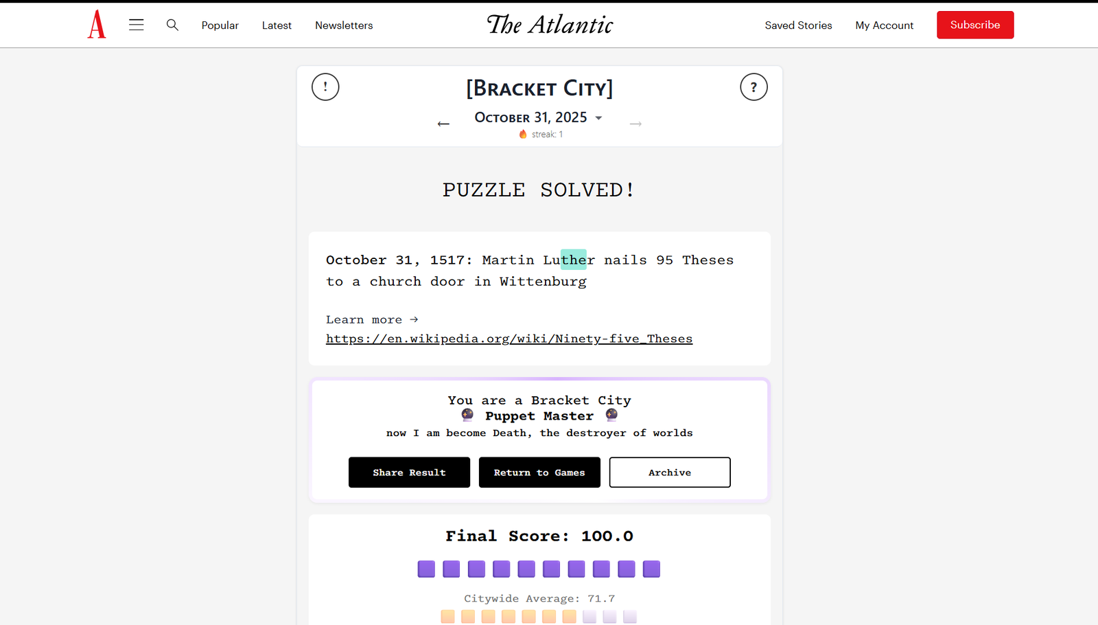 今天是10月31日星期五。您已完成本周工作,在进入周末放松模式之前,不妨用《大西洋》杂志游戏给大脑一次最后的智力挑战,让本周以智力挑战完美收官。