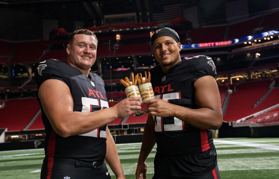 餐饮服务商利维公司(Levy)今年开启了一项创新合作计划,与NFL球员共同开发体育场特色美食。亚特兰大猎鹰队的克里斯·林德斯特罗姆(Chris Lindstrom)和马修·伯杰龙(Matthew Bergeron)展示了最新推出的桃子馅饼芭菲,这是该计划的代表作品之一。