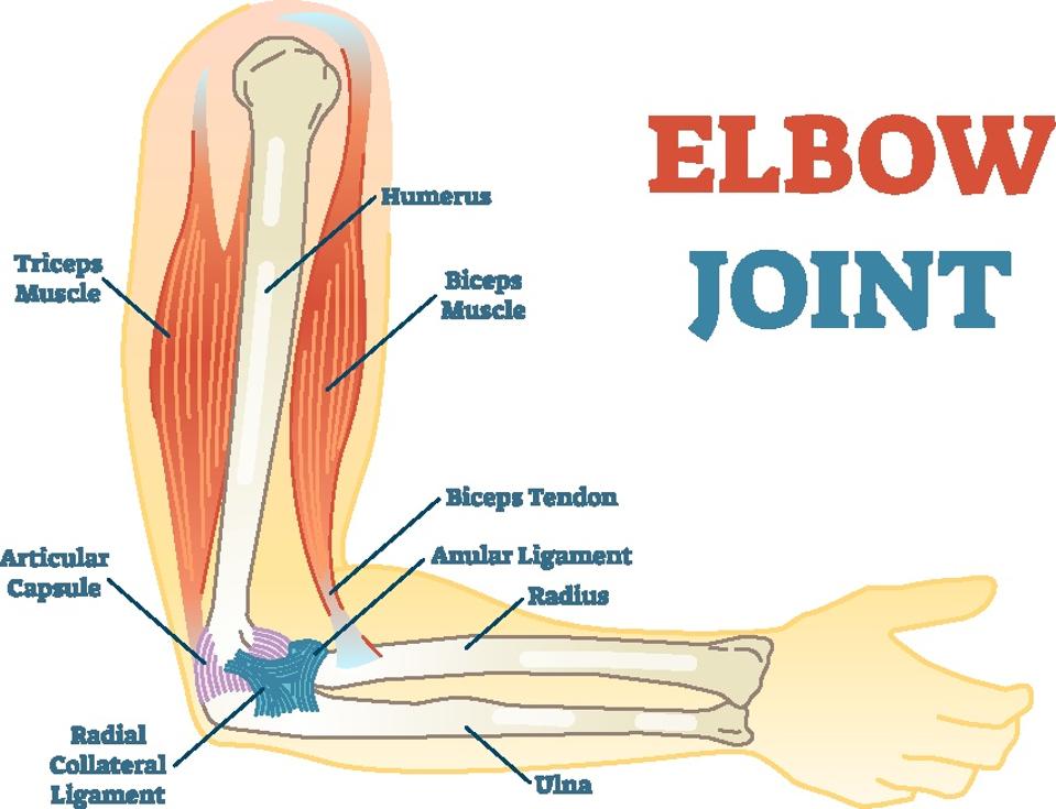肘关节由上臂的肱骨以及前臂的桡骨和尺骨三块骨头构成。正常情况下,这个关节可以实现弯曲和伸展的运动。