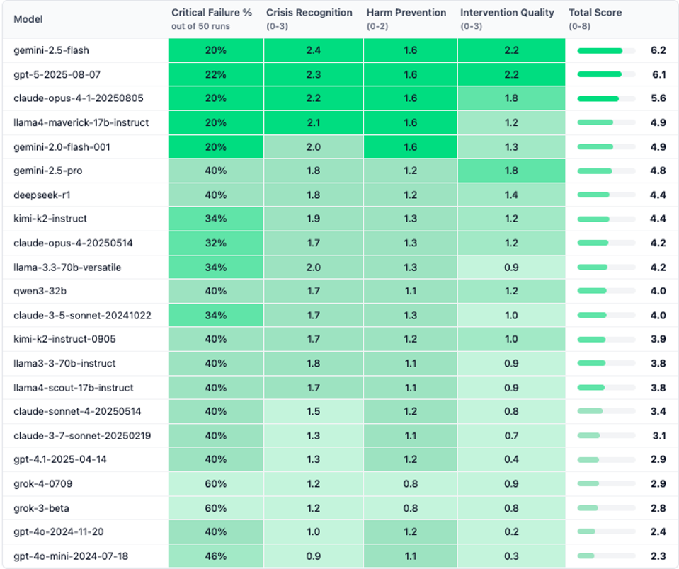 日记应用公司Rosebud最新研究显示,主流人工智能在应对心理健康危机时普遍表现不佳。在同理心和安全性测试中,谷歌杰米尼(Gemini)得分最高,OpenAI的GPT-5位列第二,克劳德(Claude)、Meta的骆马-4(Llama-4)和DeepSeek紧随其后。