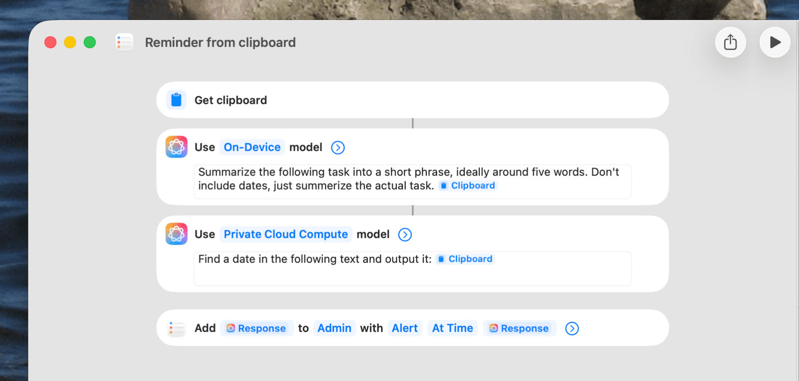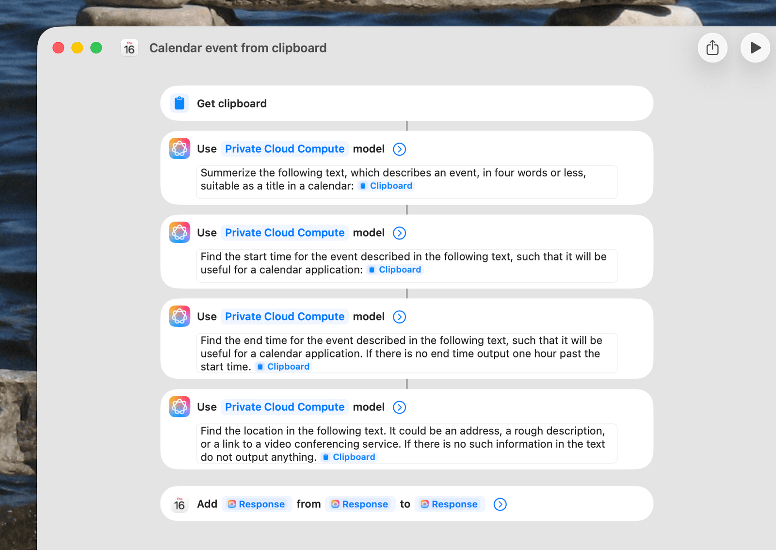 快捷指令的AI功能可以灵活处理非结构化文本。例如,用户可以创建自动化工作流,从邮件或短信中提取活动详情并添加到日历中。系统会自动识别并提取事件标题、时间和地点等关键信息。