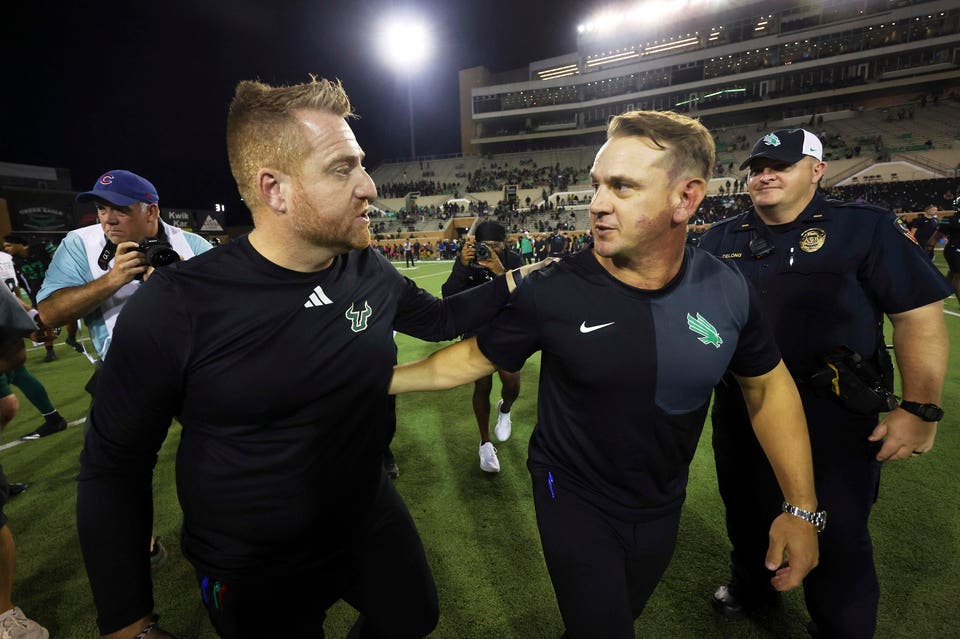 时任南佛罗里达大学(USF)主教练亚历克斯·戈莱什(Alex Golesh)与北德克萨斯大学(North Texas)主教练埃里克·莫里斯(Eric Morris)在10月10日于德克萨斯州丹顿市的比赛后交谈。