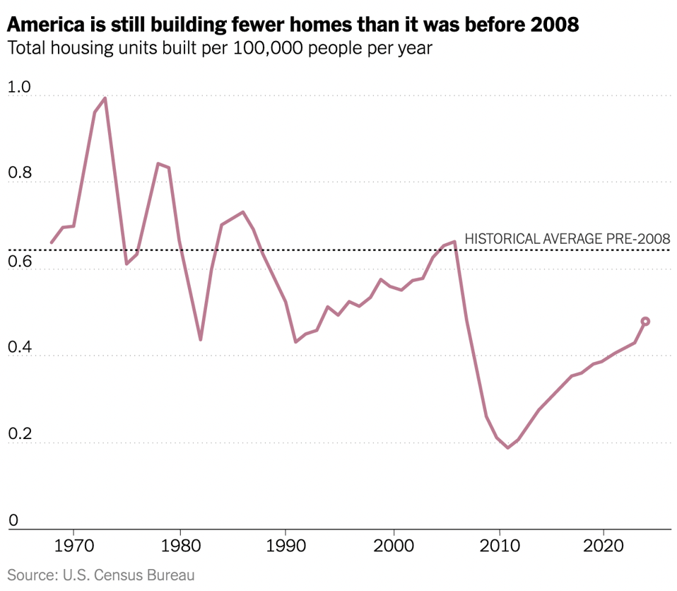 根据美国人口普查局的数据,自2008年金融危机以来,美国住房生产持续滞后。克莱因指出,"美国每10万人的住房建设量低于2005年、1995年、1985年或1975年的水平"。尽管市场需求持续存在,新房建设仍未恢复到2008年之前的水平。