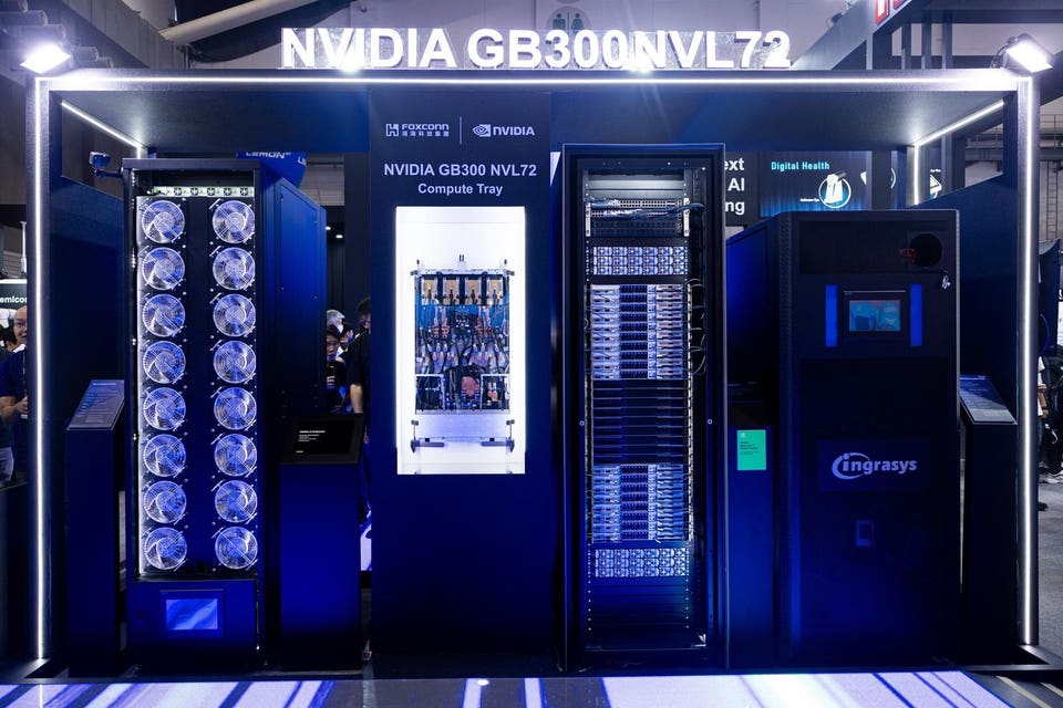 5月20日,在台北电脑展(Computex)上,英伟达公司(Nvidia Corp.)的GB300 NVL72 GPU在富士康科技公司(Foxconn Technology Co.)展台展出。本届电脑展吸引了英伟达CEO黄仁勋、高通公司(Qualcomm Inc.)CEO克里斯蒂亚诺·阿蒙(Cristiano Amon)和富士康(Foxconn)董事长刘扬伟等行业领袖参与。
