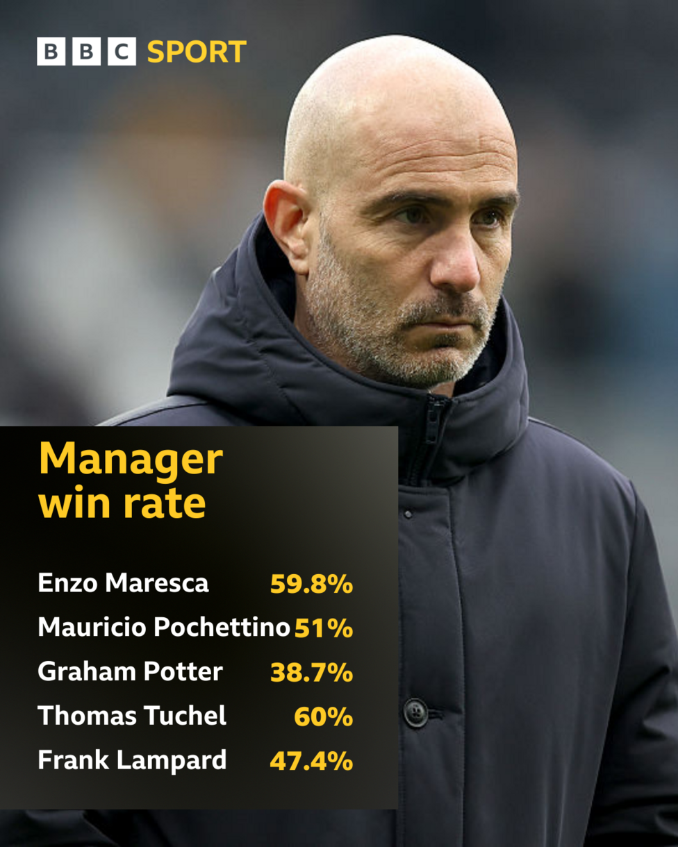 马雷斯卡的前任波切蒂诺(Mauricio Pochettino)在2023年7月至2024年5月期间执教切尔西,51场比赛取得26胜,胜率为51%。兰帕德(Frank Lampard)第二次担任临时主帅期间,11场比赛仅取得1胜2平。波特(Graham Potter)执教期间31场比赛赢得12场,胜率为38%。图赫尔在2021年1月至2022年9月期间,率队100场比赛取得60胜,仅输16场。