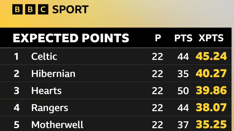 根据数据分析机构Opta的预期积分模型显示,通过模拟分析,目前排名前五的球队位置可能会发生变化:凯尔特人第一,希伯尼安第二,哈茨第三,流浪者第四,马瑟韦尔第五。