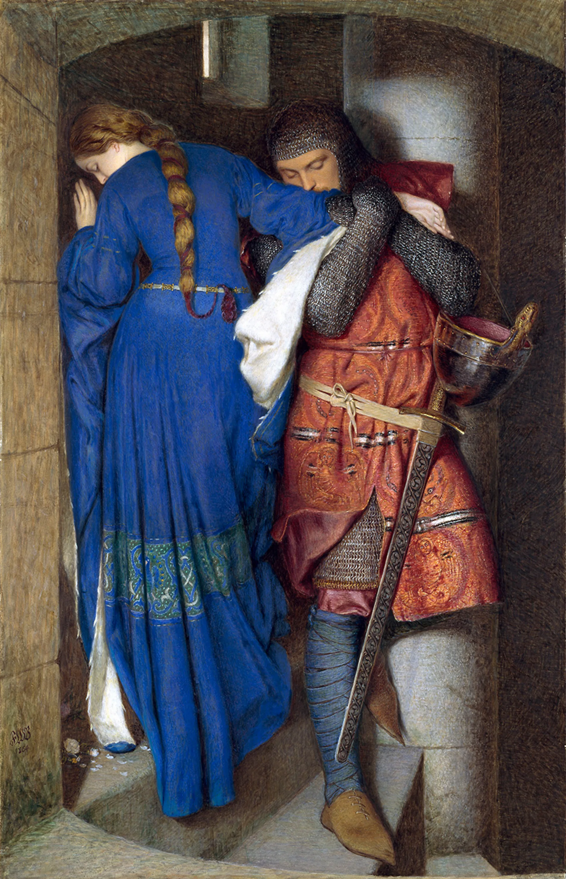 《塔楼阶梯上的相会》(The Meeting on the Turret Stairs)由弗雷德里克·威廉·伯顿(Frederic William Burton)创作于1864年,灵感源自一首中世纪丹麦民谣。这幅画作近期在社交媒体上获得广泛关注,被誉为"屏息的瞬间"。