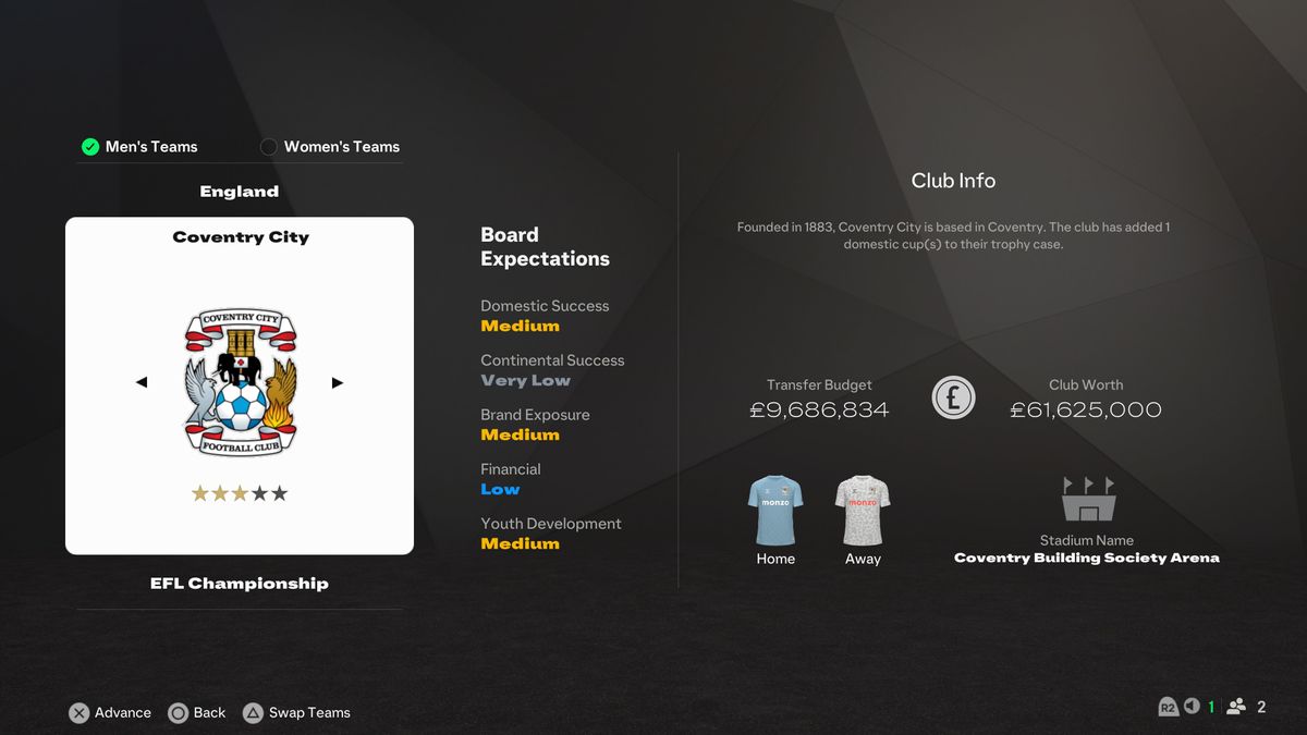 布莱克本(Blackburn)、布里斯托城(Bristol City)和考文垂(Coventry)三支英冠球队首次加入游戏。其中考文垂以960万英镑的转会预算和较低的董事会期望值,成为冲击英超的理想选择。