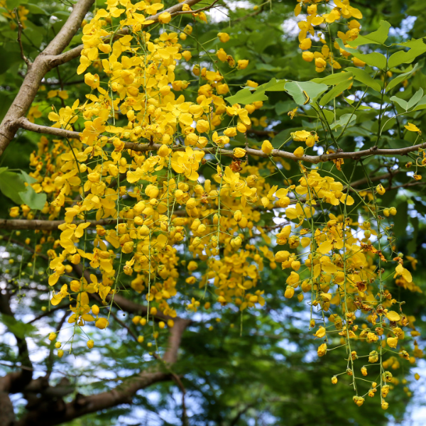 - 腊肠树:黄色花序下垂,热带地区常见行道树。