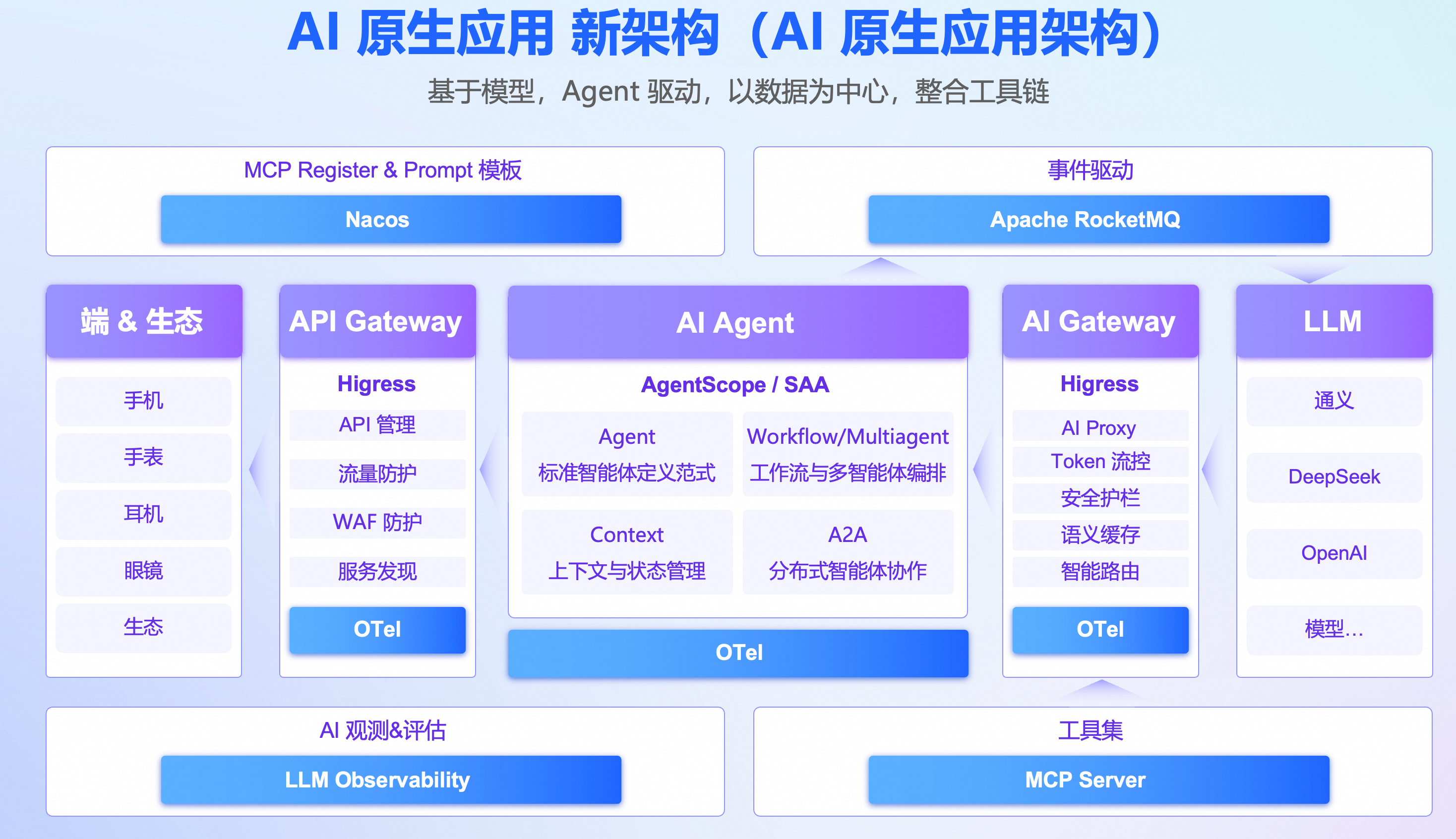 AI原生系统以大模型(如大语言模型LLM)作为基础能力引擎,通过模型的推理、生成和决策能力驱动整个系统的运行。这种架构强调模型的智能化和自主性,而非简单的“AI+”模式。