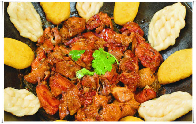 铁锅炖大鹅是东北的特色菜之一,用自家的大铁锅展示东北人的“看家本领”,用各种食材炖成一锅锅鲜美又暖身的炖菜。铁锅炖大鹅可算得上炖菜中的硬菜了,将近十斤的大鹅切成大块,与土豆、粉条等炖一锅,食材都充分吸收了鹅肉的油脂,变的异常鲜美。