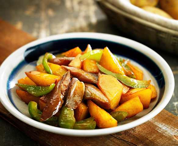 地三鲜是东北的一道传统家常菜,选用茄子、土豆、青椒三种地里时令新鲜的食材,不仅在于鲜浓的味道、天然绿色的食材,更胜于它涵盖多种食材的营养,让这道菜老少皆宜,并且油而不腻。