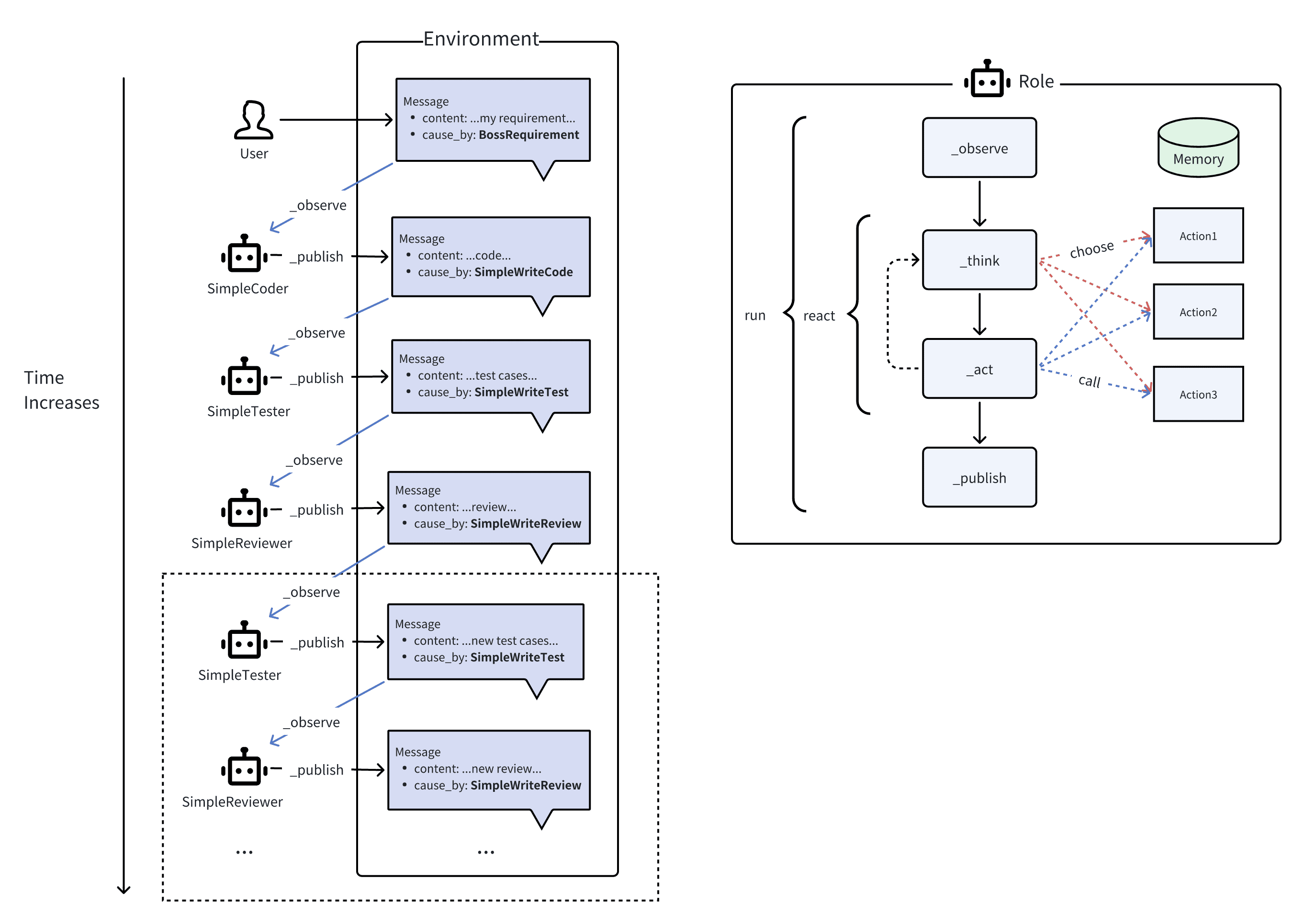 MetaGPT 是一个开源的多智能体(multi-agent)框架,通过将人类工作流(SOP, 标准操作程序)与大型语言模型(LLM)结合,模拟一个虚拟软件公司,包括产品经理、架构师、项目经理、工程师和质量工程师等角色。