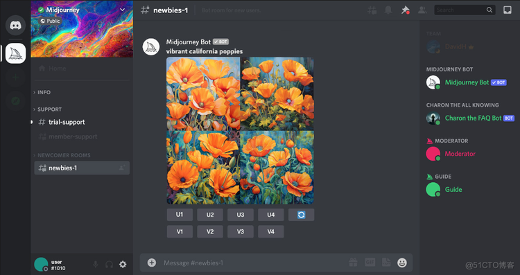 - Midjourney系统会自动生成四个基于你的关键字描述的图像。