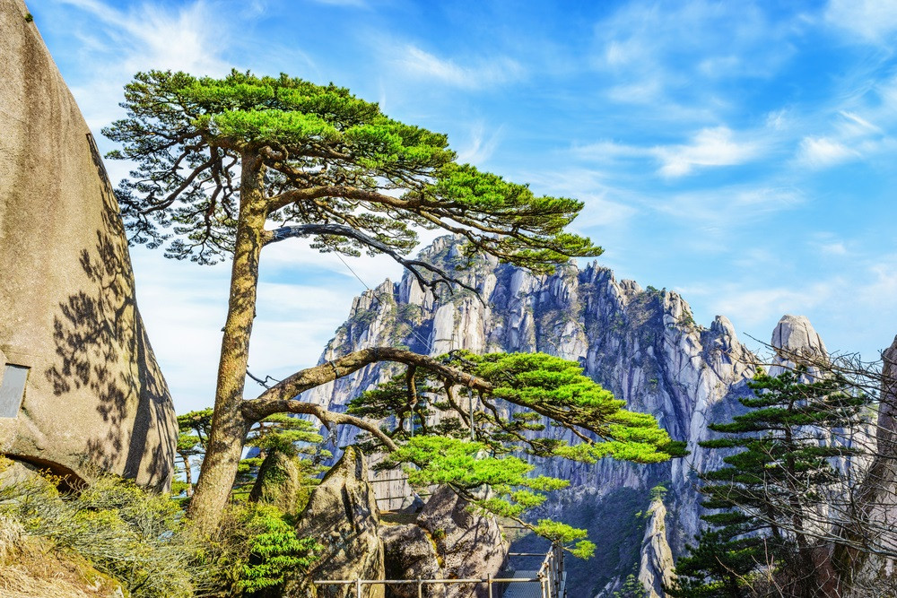 黄山松因奇峰怪石间的独特生长姿态闻名,其枝干虬曲如游龙,针叶苍翠密集,尤以"迎客松"造型最具标志性。在悬崖峭壁上呈现"顶平如削、枝桠横展"的天然盆景效果,展现逆境求生的苍劲之美