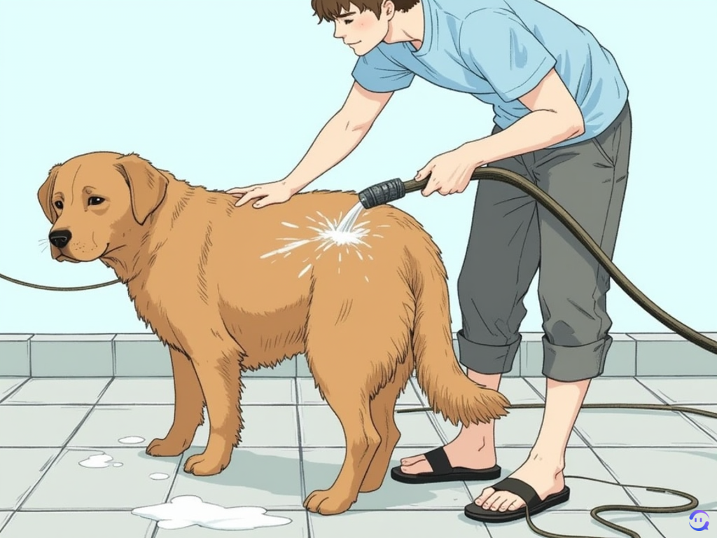 用狗狗洗发水抹到狗狗的毛发上,尤其是受影响的区域。彻底冲洗干净,再用干净的毛巾擦干。