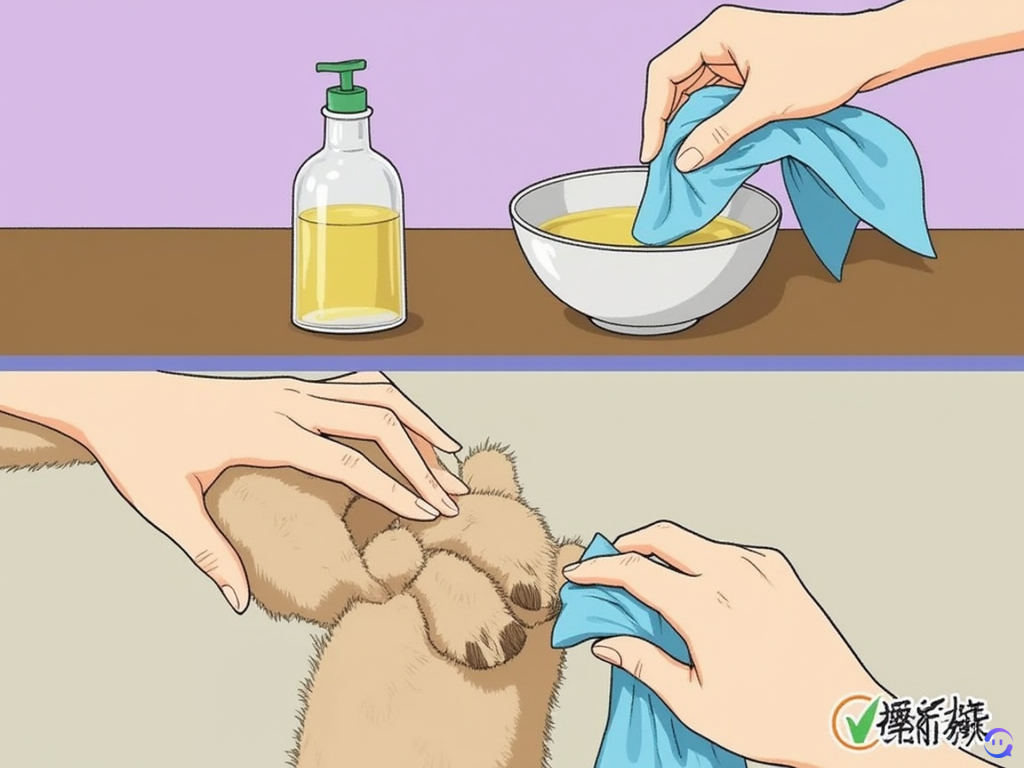 如果口香糖还在,可以用抹布沾橄榄油涂抹在爪子上,拿另一块抹布蘸取橄榄油,然后擦在狗狗的爪子上。用抹布轻轻捡拿口香糖,尝试把它移除。避免拉扯口香糖,使用左右移动的方式尝试将它从狗狗的爪子上移开。作为替代方案,你还可以使用油性沙拉酱来松动口香糖。