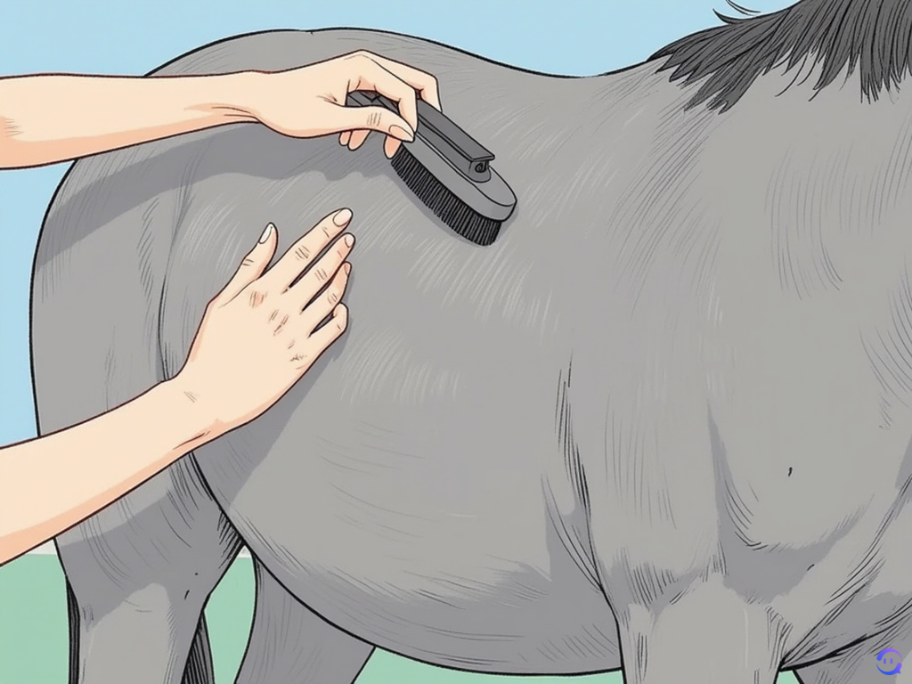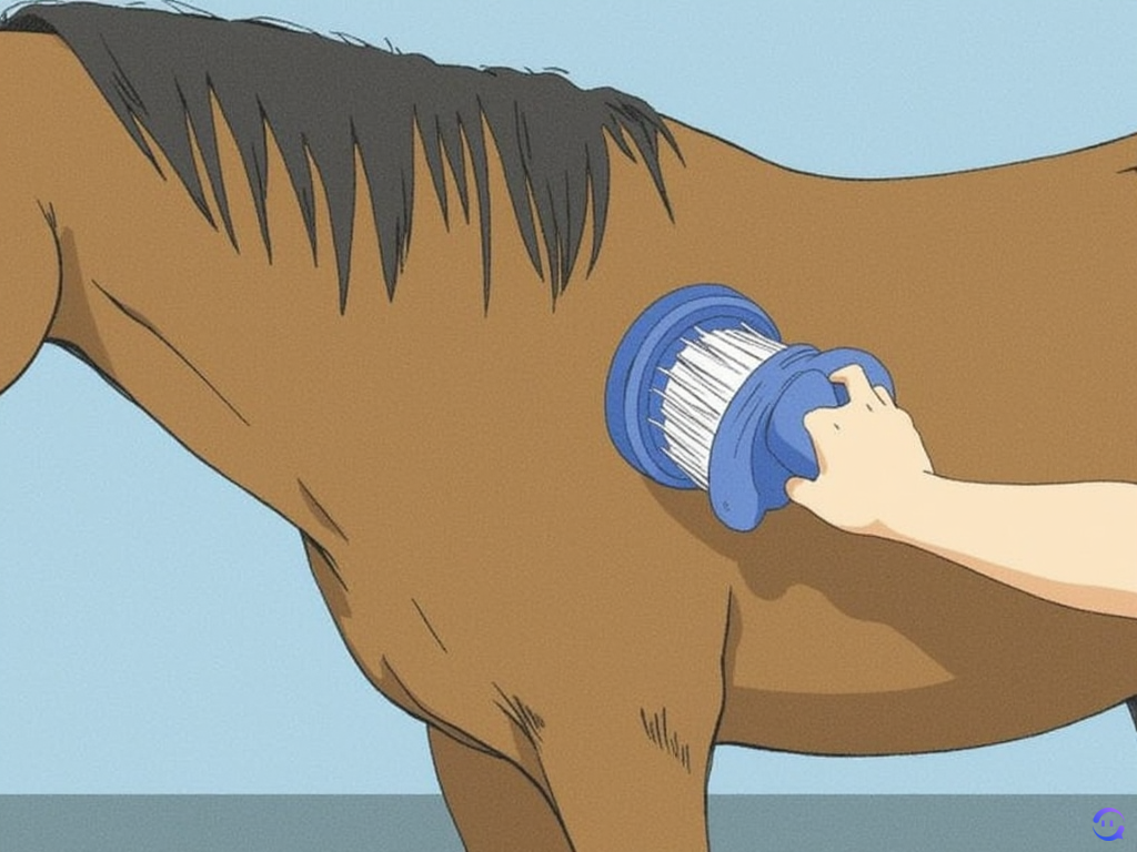 绕着马的身体梳理,注意骨骼突出和敏感的区域。暂时避免使用刮刷梳理头部、鬃毛、下腿或其他特别敏感的部位。