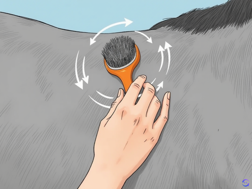 从马的颈部顶部开始,用刮刷以圆周运动轻轻梳理马匹的身体。按照马毛的生长方向施压,就像是在给马做按摩一样。