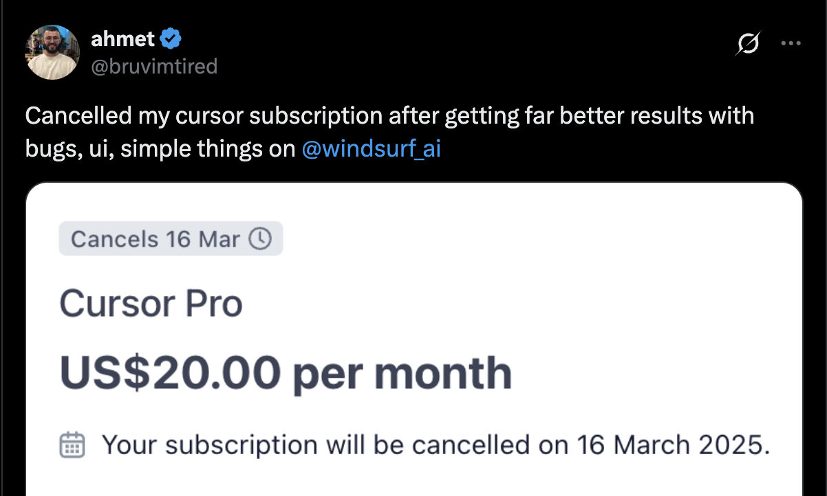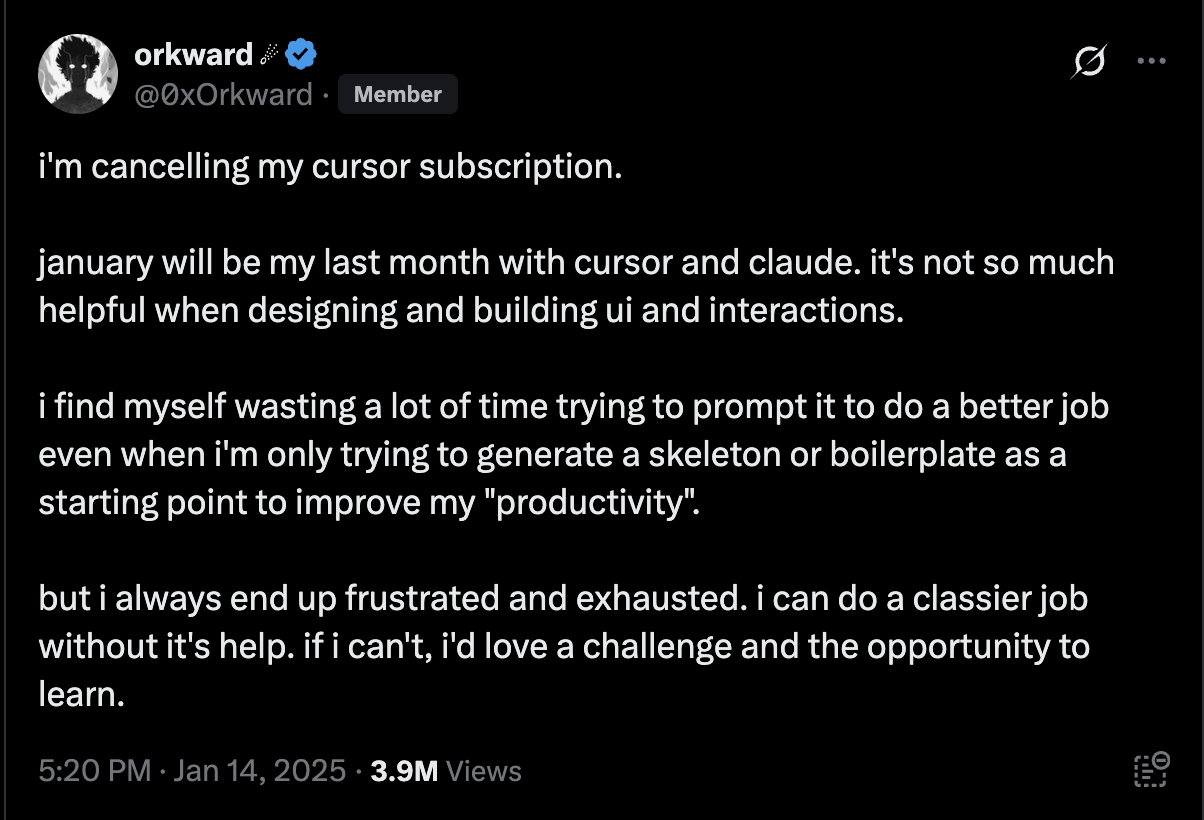 值得注意的是,越来越多的开发者正在放弃订阅。他们对Cursor性能下降、隐藏费用以及偏离开发者至上理念感到失望。
