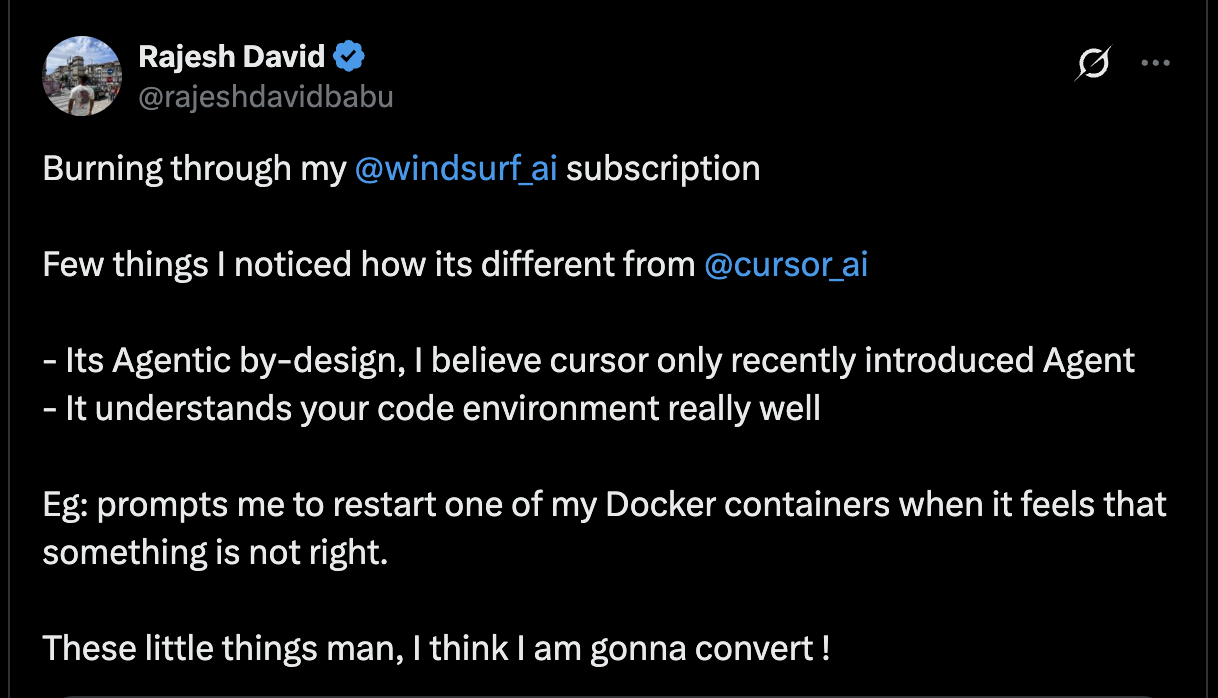 Groq公司AI研究员Rick Lamers表示,他后悔没有更早尝试Windsurf,认为其"比Cursor更具主动性"。社区讨论中,用户普遍认为Windsurf在多文件编辑等场景下表现更优。